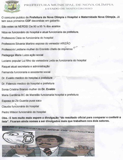 Inclusive, está circulando pela cidade uma lista com os nomes das pessoas que teriam sido beneficiadas e constam como aprovadas no resultado extra-oficial já divulgado. "Esses são os nerds de 90% a 95% de acerto", diz o planfleto impresso em papel timbrado da prefeitura. Ao final, os autores da "arte" pedem que a população aguarde o resultado oficial para comparar e conferir os nomes, afirmando que outros vão surgir.
