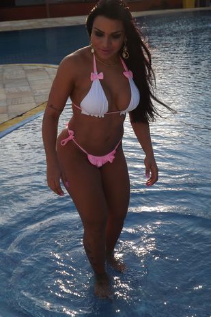 De salto alto, Mariana tirou fotos com biquínis de lacinho e até com modelos fio dental.