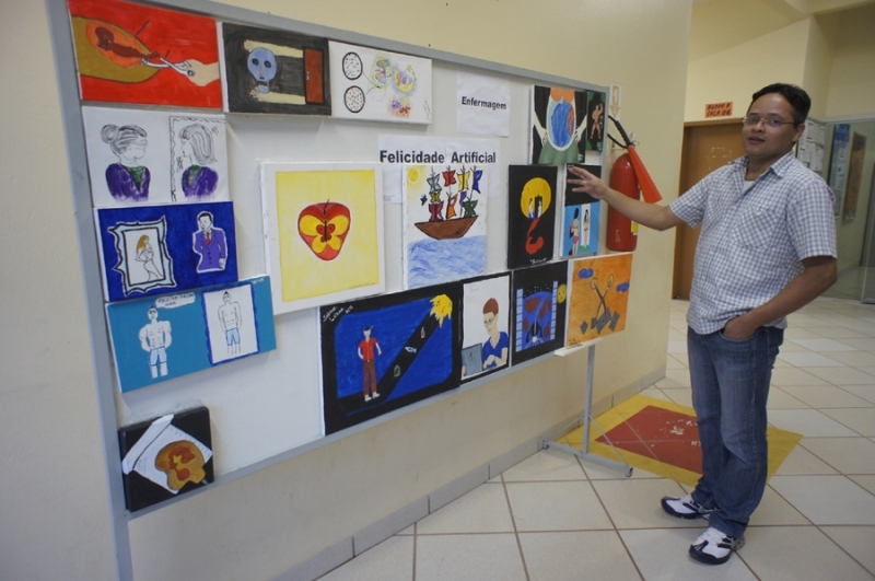O professor de filosofia Marivelto Xavier faz uso da metodologia artística para aplicar o conteúdo em sala de aula; a interpretação textual, por meio da pintura, redeu um painel de exposição na Faculdade de Ciências Sociais e Aplicadas de Diamantino (UNED).