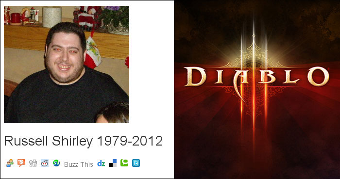 Russ, um homem de 32 anos, morreu por jogar o game Diablo 3 durante vários dias seguidos. A notícia foi dada pelo blog BuildStarted, que fez um apelo para que os jogadores de videogame não sigam o exemplo e evitem ficar tanto tempo jogando, para que não fiquem viciados.