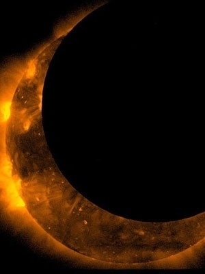 Um eclipse do Sol ocorre quando a Lua se coloca entre a Terra e a estrela. Quando ele é anular, cria um anel de fogo em volta da sombra do satélite.