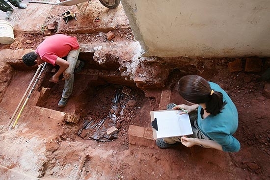 A arqueóloga Patricia Fischer (de verde) monitora escavação realizada em escola de