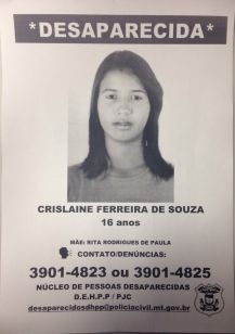Crislaine é filha adotiva de Rita e completa 17 anos na próxima terça-feira (05). A mãe pede ajuda de quem souber da garota para acionar o Núcleo de Pessoas Desparecidas da Delegacia de Homicídios e Proteção à Pessoa (DHPP). Os contatos são: (65) 3901-4823 e 3901-4825. Outro canal de comunicação com a Polícia é através do e-mail desparecidosdhpp@policiacivil.mt.gov.br.