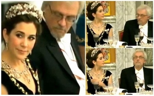 A rainha da Dinamarca estava oferecendo um jantar de gala em Copenhague. Mas Pentti Arajarvi, marido da presidente da Finlândia, Tarja Halonen, tinha outro apetite. Ele foi flagrado dando uma olhada no decote da princesa Mary, sentada ao lado. Ela percebeu o atrevimento e olhou de cara feia para Pentti, um jurista de 63 anos. O finlandês cara de pau disfarçou e fingiu estar reparando algo no teto. Nascida na Austrália, Mary Elizabeth Donaldson, de 39 anos, é casada com o príncipe herdeiro da Dinamarca, Frederik.
