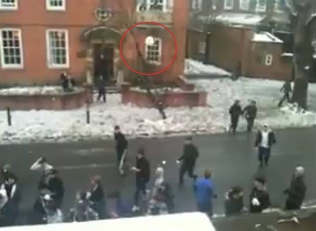 Um vídeo publicado na internet mostra uma pessoa filmando de uma janela uma batalha de bolas de neve envolvendo vários estudantes de uma escola na Inglaterra, mas a filmagem acaba sendo interrompida abruptamente depois que um dos jovens lançou uma bola e acertou justamente a janela onde a pessoa estava filmando (assista ao vídeo).