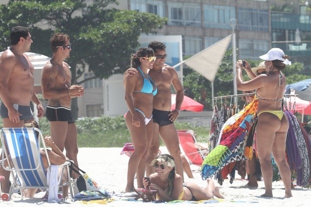 Jaque Khury deu boas risadas nesta sexta-feira, 2. A panicat se divertiu ao lado do namorado e conversou animadamente com alguns amigos na praia do Pepê, na Barra da Tijuca, na Zona Oeste do Rio. Os dois trocaram muitos beijos e carinhos.