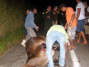 Uma caminhonete bateu em uma boiada neste domingo (8) na MT-208, próximo a Alta Floresta, a 800 quilômetros de Cuiabá, e um animal foi arremessado em direção a um veículo de passeio que seguia em sentido contrário. Segundo informações da Polícia Militar do município, quatro animais morreram, mas os ocupantes dos veículos não ficaram feridos.