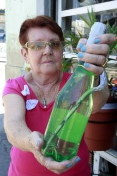 Marieta Logulo mostra a garrafa lacrada com o ferro Foto: Fabiano Rocha No meio de tantas garrafas de sidra compradas para revender em sua loja de artigos religiosos, uma em especial chamou a atenção da comerciante Marieta Logulo dos Santos, de 75 anos. O produto, da marca Reggiani, veio com um pedaço de ferro dentro, e nem foi para a prateleira. Vai que Iemanjá recusa a oferenda com defeito?