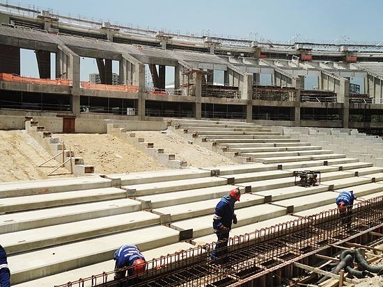 O Consórcio Maracanã Rio 2014 divulgou imagens das peças de concreto armado sendo instaladas durante o processo de construção das novas arquibancadas do estádio.