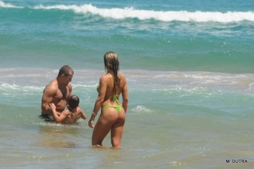 Joana Machado, com muito dinheiro na conta, aproveita o mar da Praia de Geribá, em Búzios. A loura está no balneário, onde frequenta desde a adolescência, acompanhada do namorado, Junior Figueiredo, e do filho caçula, Maurício. Entre um mergulho e outro, Joana dá aquela famosa ajeitadinha no biquíni. A praia só acabou no fim da tarde, quando decidiram ir embora.