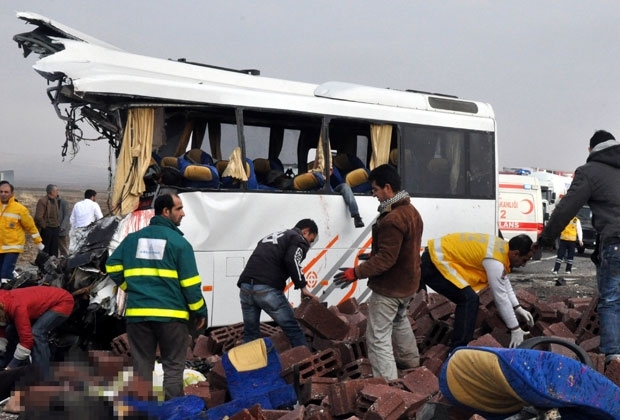 Um caminhão que transportava tijolos bateu no micro-ônibus, informou o governador de Diyarbakir, Mustafa Toprak. A polícia atribuiu o acidente à alta velocidade do caminhão. Segundo uma rede de televisão local, oito pessoas ficaram feridas.