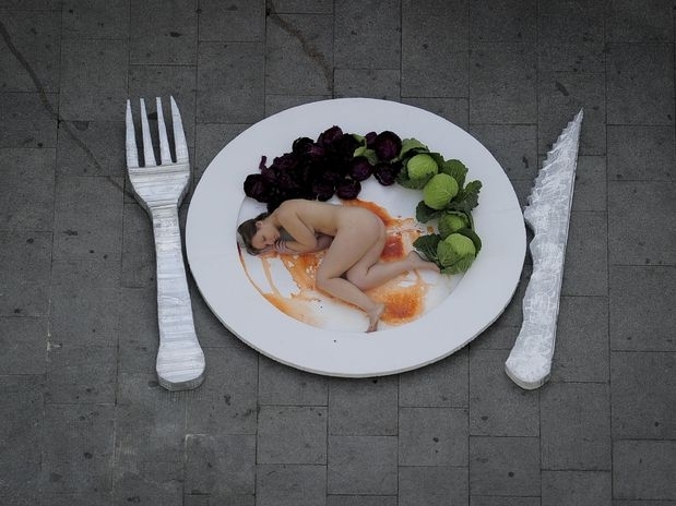 Um prato gigante sobre o qual jaz um corpo nu de uma voluntária, acompanhada de diferentes guarnições e sangue simulado, foi a performance que a AnimaNaturalis realizou na quinta-feira (15) em frente a um mercado de Barcelona para sensibilizar os consumidores carnívoros.