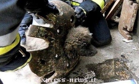 Um cão precisou ser resgatado pelos bombeiros em Krotoszyn, na Polônia, depois que ficou com a cabeça presa em uma roda. Os bombeiros colocaram azeite no pescoço do cachorro para conseguir retirá-lo, segundo o site italiano "Express-news".