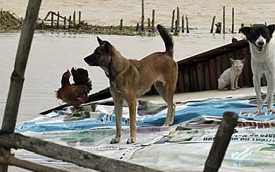 Cães, um gato e uma galinha dividem o telhado de uma casa cercada pelas águas de inundações provocadas pelo tufão ‘Nari’ em Bulacan, ao norte de Manila, nas Filipinas. (Foto: Bullit Marquez / AP Photo)