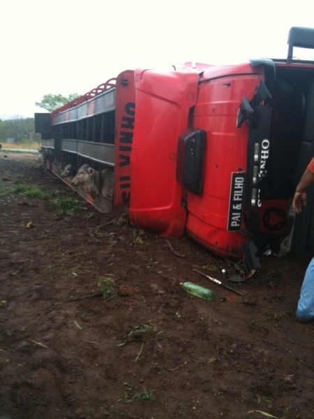 Por conta da chuva, um caminhão boiadeiro perdeu o controle em uma curva da MS 080 e tombou. Ao chegar no local do acidente, alguns bezerros, no caminhão, cerca de 100 animais agonizam, uns sobre os outros, sem ter como sair. O motorista, Silvio Aparecido de Oliveira, 44 anos, teve algumas escoriações.