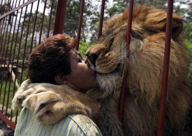 Fundadora de um abrigo de animais em Cali, na Colômbia, a professora Ana Julia Torres, de 52, foi fotografada no sábado (17) beijando o leão chamado "Jupiter", que foi resgatado de um circo há 12 anos.