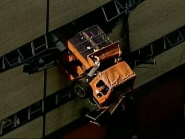 O caminhão, usado para espalhar sal sobre estradas em dias de neve, demoliu uma parede e ficou pendurado por horas. Os bombeiros usaram um guindaste para resgatar o motorista Robert Legall, que estava dentro do veículo.