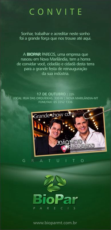 Para comemorar a reinauguração de suas instalações, a empresa realizará no próximo dia 17 de Outubro, quinta-feira, as 22hs, gratuitamente, o show nacional com a dupla João Neto e Frederico, que acontecerá nas proximidades da empresa.