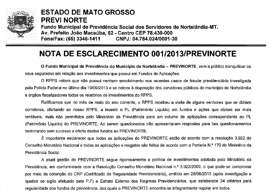 A diretoria do Fundo Municipal de Previdência de Nortelândia (PreviNorte) divulgou nota assegurando que não possui nenhum envolvimento nos casos de fraudes previdenciárias investigadas pela Polícia Federal. Além disso, coloca à disposição dos associados e órgãos de fiscalização todos os relatórios de investimentos do RPPS. A nota foi divulgada após RDNews publicar reportagem revelando que a Prefeitura de Nortelândia também assediada pela quadrilha desmantelada pela Operação Miquéias, no último dia 19. O município foi mencionado em conversas entre Luciane Hoepers - conhecida como "Musa do Crime" - e o advogado Marden Tortorelli, interceptadas com autorização judicial.