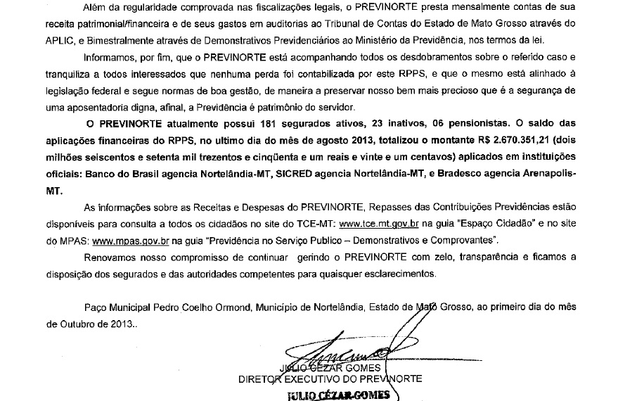 Por fim, o Previnorte garante que nenhuma perda foi contabilizada no RPPS. O saldo de aplicações financeiras até o final de agosto, de acordo com a diretoria, totalizou R$ 2,6 milhões. Os valores estão aplicados no Banco do Brasil, Sicred e Bradesco.