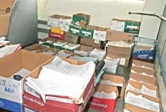 Processos referentes à dívida ativa do governo do Estado são armazenados em caixas espalhadas pelo chão de uma sala toma