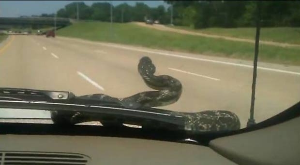 Uma família levou um susto depois que uma cobra apareceu de repente no para-brisa do veículo em uma estrada em Memphis, nos EUA. Segundo reportagem do jornal "New York Daily News", Rachel Fisher, de 26 anos, estava dirigindo a mais de 100 km/h quando o réptil surgiu. Seu marido, Tony, que estava sentado ao lado, gravou o vídeo que mostra o casal e os três filhos, Elizabeth, de 3 anos, Judah, de 2, e Rivers, de quatro meses, surpresos com a "visita" inesperada.