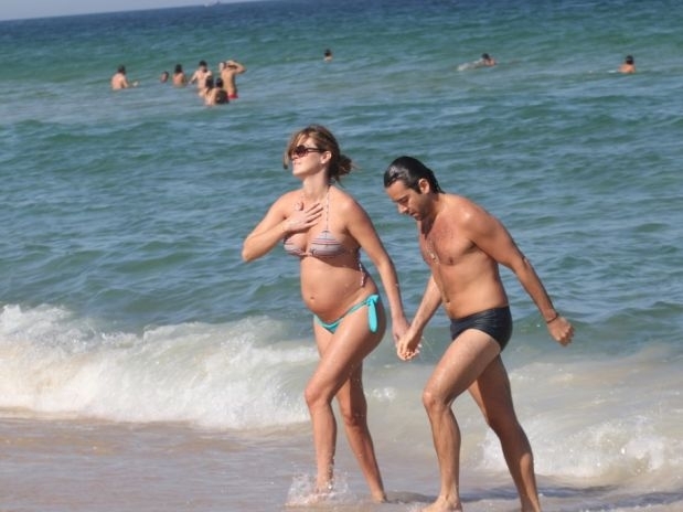 Letícia Birkheuer desfilou seu barrigão de seis meses de gestação pela praia de Ipanema, no Rio de Janeiro, neste sábado (16).