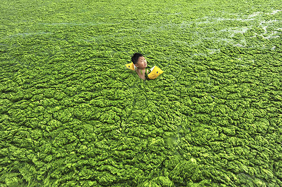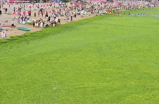 Esqueça a ideia de um mar de águas azuis e cristalinas. Os chineses de Qingdao decidiram encarar um mar inteiramente coberto de algas para não perder a chance de curtir um sábado de sol.