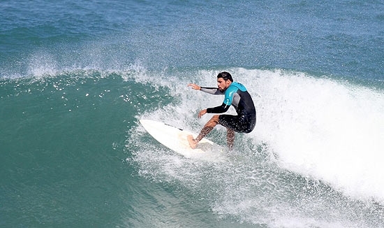 Apesar do tempo nublado e da temperatura bem inferior aos 40ºC a que chega a cidade no verão, o ator aproveitou a folga para surfar.