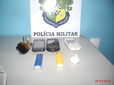 No local foi encontrado e apreendido: uma trouxa de substancia análoga de cocaína, um garrafão de vinho e quatro aparelhos celulares.