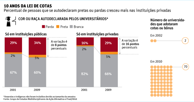Dados tabulados pela Folha a partir da Pesquisa Nacional por Amostra de Domicílios do IBGE mostram que, no ensino superior, a proporção de autodeclarados pretos e pardos cresceu de 21% para 35% de 2001 a 2009.