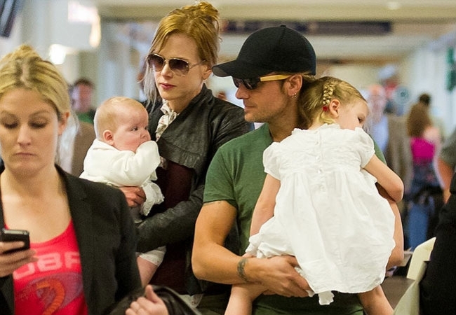 Nicole Kidman foi fotografada na noite de terça-feira (24) com as filhas pequenas no colo, no aeroporto de Los Angeles. A atriz australiana, acompanhada do marido, o cantor country Keith Urban, evitou os flashes dos paparazzi enquanto Faith Margaret, 5 meses, e Sunday Rose, de 2 anos, descansavam.