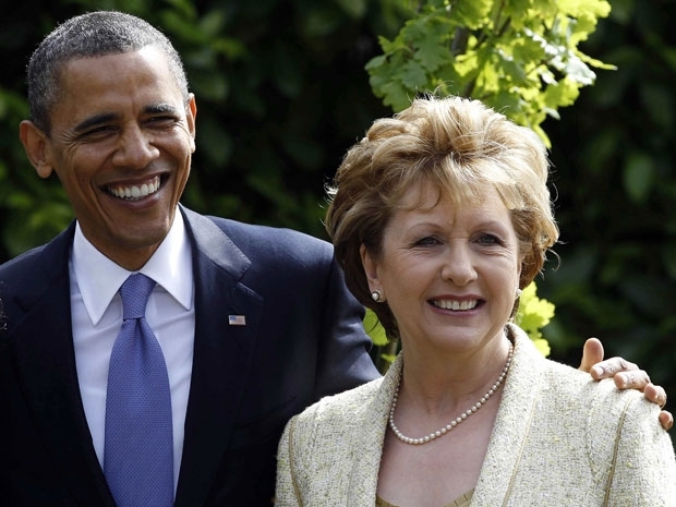 Barack Obama posa para foto com a presidente irlandesa, Mary McAleese, em Dublin (Foto: Reuters)Mas o grande momento da visita à ilha, cercada por um grande dispositivo de segurança como a da rainha Elizabeth II na semana passada, será a viagem à pequena cidade de Moneygall, de onde era originário um dos tataravós de Obama por parte de mãe.