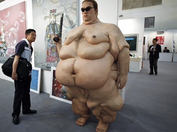 A obra intitulada "Arnold Schwarzenegger" foi destaque de uma feira de arte contemporânea inaugurada neste sábado (30), em Pequim, na China. A escultura do artista plástico Shu Yong mostra o governador da Califórnia numa versão nua e obesa e com os óculos e a arma de seu mais famoso personagem no cinema, o "exterminador do futuro".