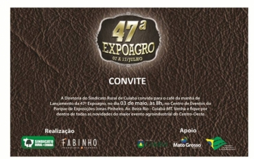 O Sindicato Rural de Cuiabá fará o lançamento oficial da 47 ª EXPOAGRO - Exposição Internacional, Agropecuária, Industrial e Comercial de Mato Grosso, no próximo dia 03 de maio, durante um café da manhã, às 8h, no Centro de Eventos da Acrimat, no Parque de Exposições Jonas Pinheiros, em Cuiabá (MT).