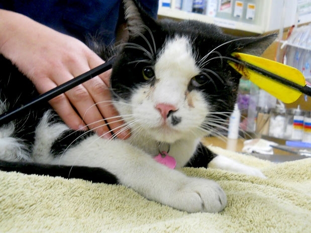 "Segundo os donos, o gato estava desaparecido havia dois dias, e quando eles abriram a porta da casa, ele entrou", disse o gerente do Santa Cruz County Animal Services, Todd Stosuy. "Foi quanto eles viram uma flecha presa na cabeça do gato", disse ele. "O gato estava agindo normalmente, comendo normalmente. Quase parecia uma daquelas flechas falsas", afirmou Stosuy.