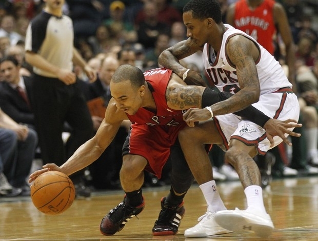 Jerryd Bayless, do Toronto, sofre a implacável marcação de Brandon Jennings (Foto: AP)Confira os duelos desta segunda