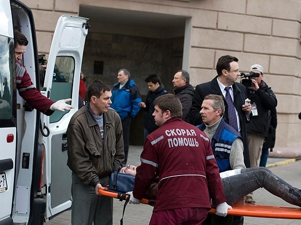 Uma fumaça negra saía da estação do metrô de Oktiabrska e os passageiros, muitos ensanguentados, estavam sendo socorridos pelo Corpo de Bombeiros e levados de ambulância.