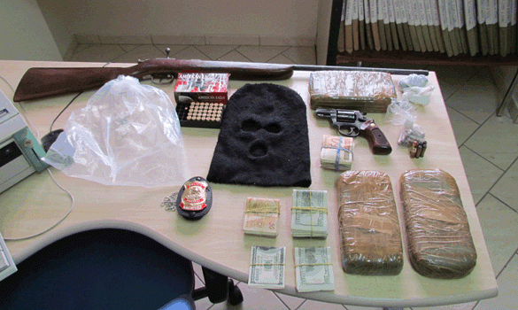 No total já foram apreendidos três carros, duas motos, quinze mil dólares, doze mil reais, duas armas e aproximadamente 3,5 quilos de entorpecentes (maconha, cocaína base, maconha e crack).