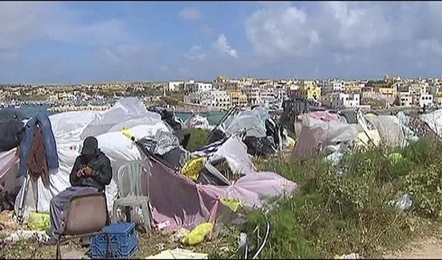 Iha italiana vem recebendo imigrantes da Tunísia e da Líbia desde janeiro (Foto: Reprodução / BBC)Muitos imigrantes ficaram em condições precárias na ilha.