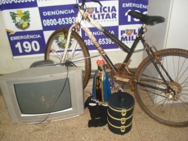 Policias do 6º Batalhão apreende nesta madrugada, na Rua Padre Cassemiro, próximo à avenida São Luíz, em Cáceres-, uma bicicleta, uma TV 29 polegadas, três marmitas, uma imagem de Nossa Senhora Aparecida e generos alimentícios. Os produtos foram abandonados por elemento não identificado, que saiu correndo ao avistar a viatura da PM.