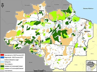 O número representa uma redução de 28% em relação a fevereiro de 2010 quando o desmatamento detectado somou 87 km². No entanto, o Imazon ressalva que foi possível monitorar somente 12% da área florestal na Amazônia Legal em fevereiro, já que os outros 88% estavam cobertos por nuvens. Em virtude disso, os dados podem estar subestimados.