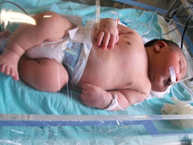 Segundo ele, o último ultrassom feito pela mulher indicava o peso de 4,5 quilos. "Não imaginávamos que tivesse esse tamanho todo. Fizemos o exame uma semana antes do parto. Estamos felizes que ele está bem e com saúde", disse o pai.