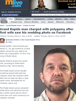 A primeira mulher do americano Richard Leon Barton descobriu sobre o seu segundo casamento após fotos da festa terem sido publicadas no Facebook. A americana começou a suspeitar do marido depois que ela percebeu que o perfil de Richard estava indisponível.