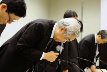 A alta cúpula da Tokyo Electric Power Co. (maior concessionária de energia elétrica do Japão) se curvou nesta segunda-feira para se desculpar com a população japonesa pelos acidentes na usina nuclear de Fukushima. O vice-presidente Sakae Muto (à direita) e outros executivos tiveram essa atitude durante uma entrevista coletiva em Tóquio. Nesta segunda-feira houve uma explosão de hidrogênio em um reator da usina.