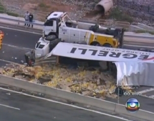 Acidente aconteceu no trevo de Osasco. Segundo a Autoban, que administra a estrada, a carga foi saqueada.
