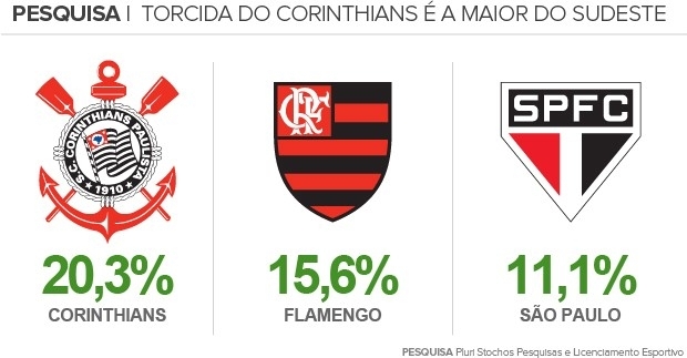 A torcida do Corinthians é a maior do Sudeste, segundo análise da Pluri Stochos Pesquisas e Licenciamento Esportivo. A empresa de consultoria esportiva, que realizou uma pesquisa de abrangência nacional divulgada em março, revelou os últimos detalhes da setorização do estudo por regiões do Brasil. Nos estados de São Paulo, Rio de Janeiro, Minas Gerais e Espírito Santo, a Fiel lidera a preferência do público com 20,3% dos entrevistados: 4,7 pontos percentuais a mais que os torcedores do Flamengo, que somam 15,6% no território
