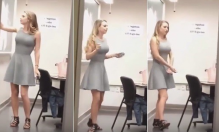 Na filmagem de apenas 45 segundos, feita pelos estudantes, a professora da Bielorrússia, aparece usando um vestido curto enquanto escreve equações no quadro e chama atenção por sua beleza.