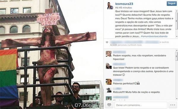 Léo Moura ficou indignado com uma imagem que viu na Parada Gay, neste domingo em São Paulo. Evangélico, o lateral-direito do Fort Lauderdale Strikes postou no Instagram a foto de uma pessoa crucificada na Avenida Paulista, com os dizeres "Basta de Homofobia".