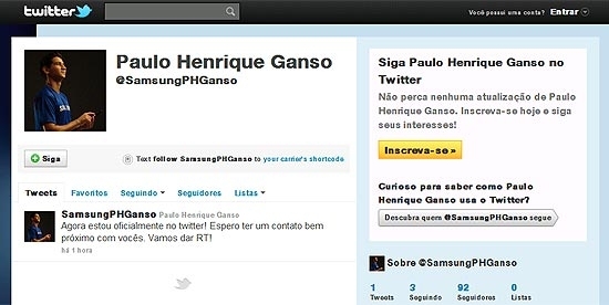 O meia santista Paulo Henrique Ganso criou sua conta no Twitter na tarde desta quinta-feira. E, assim como Ronaldo fez ano passado, tem seu nome ligado a uma empresa na rede social.